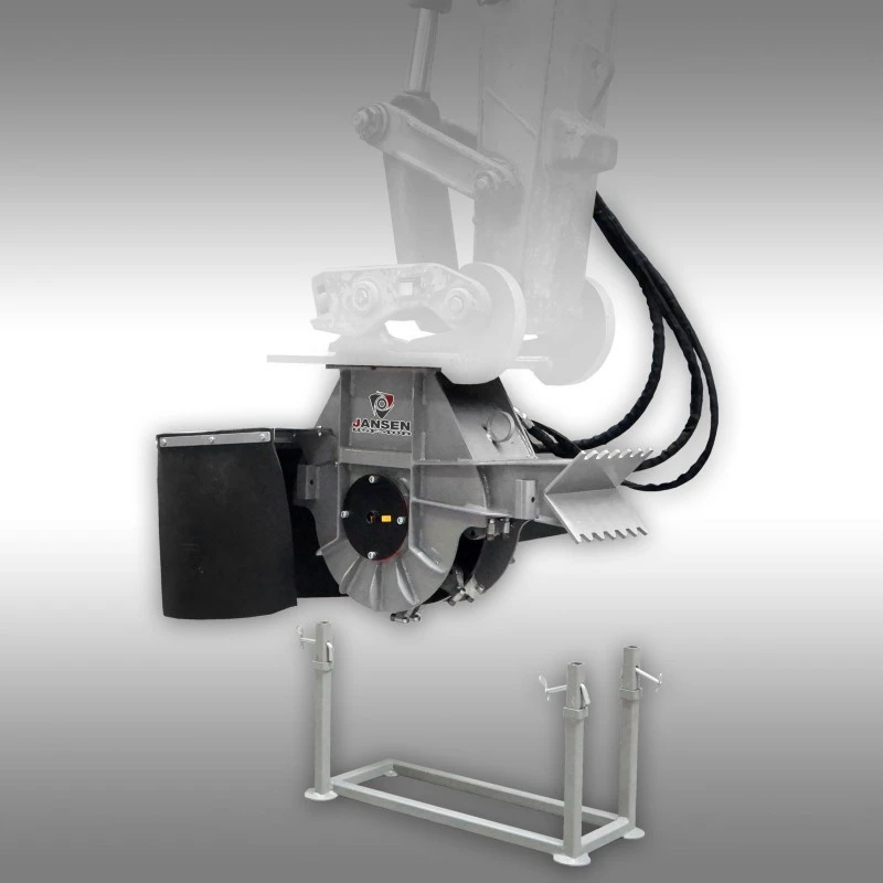 De machine is ontworpen voor de aanbouw aan uw graafmachine. De stobbenfrees BSF-40B wordt geleverd met een universele montageplaat. De snelwissel-opname voor uw graafmachine is in de normale handel verkrijgbaar maar dient door u te worden verbonden met de universele plaat van onze stobbenfrees! Eventueel zijn er aanpassingen nodig.